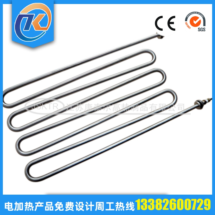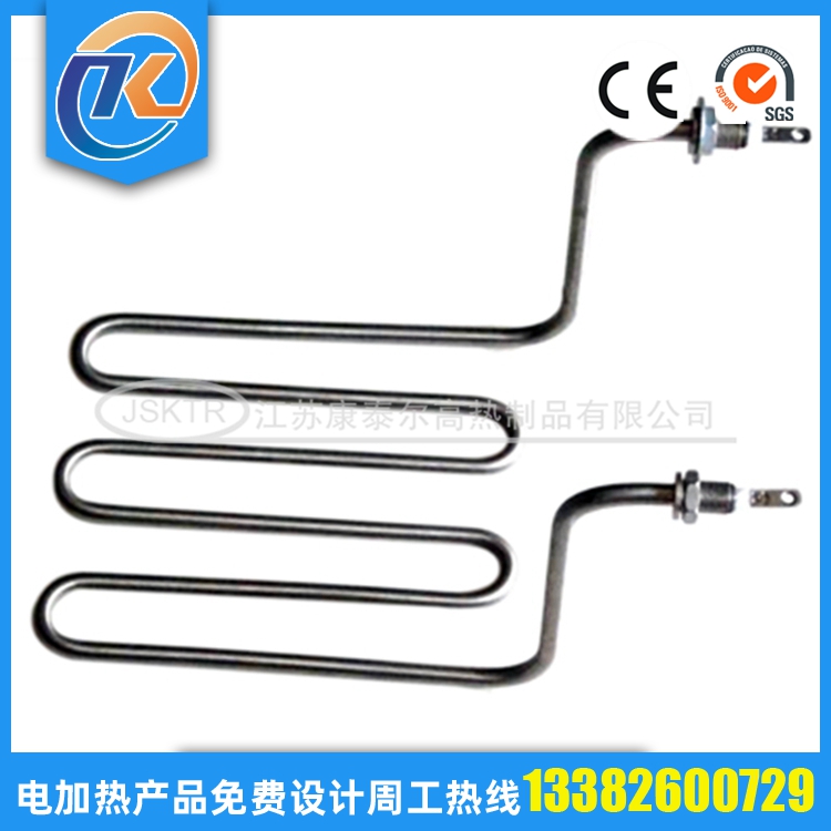 法蘭電加熱管(也稱插入式電加熱器):是采用U型電熱管,依據(jù)加熱的空氣或者水油等來(lái)設(shè)計(jì),按照功率配置要求裝配在法蘭蓋上,插入需加熱物料中,當(dāng)介質(zhì)溫度達(dá)到工藝要求時(shí),持續(xù)保持加熱;而當(dāng)發(fā)熱元件超溫或低液位時(shí),發(fā)熱元件的聯(lián)鎖保護(hù)裝置立即切斷加熱電源避免發(fā)熱元件燒壞,延長(zhǎng)使用壽命。 應(yīng)用范圍 法蘭電熱管訂購(gòu)參數(shù): 1.電壓,功率; 2.材質(zhì); 3.管徑; 4.長(zhǎng)度; 5.數(shù)量; 6.加熱什么,長(zhǎng)期溫度多少; 7.加熱管類型;